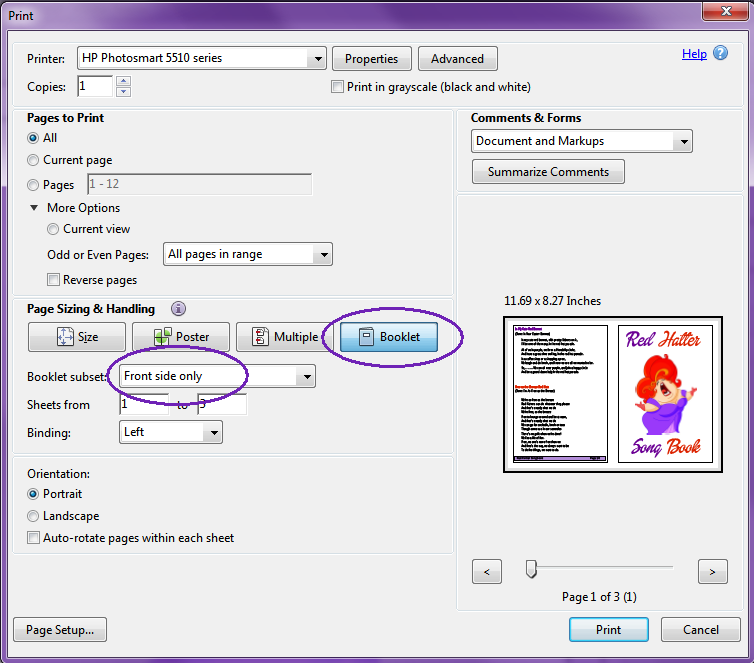 To print as an A5 Booklet, open the file in Adobe reader and select the print option. Select the “booklet” option and make sure it is set to print the front side and all 3 pages. The click print.