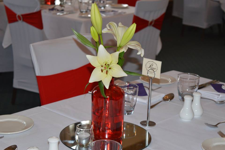 The room was very elegant with red sashes around each chair and fresh flowers as table centre pieces.