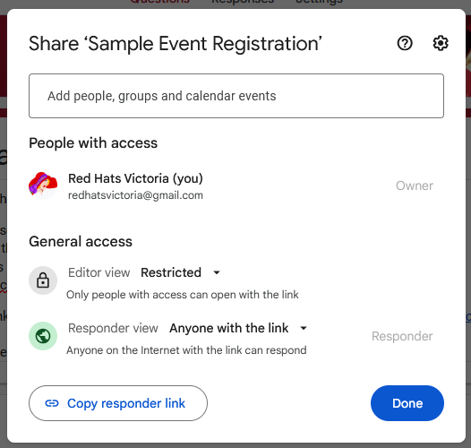 Copy the link and you can then use it in your event flyer – or use the Google Form itself as your event notice (if you’ve put all the info on the event in the description part.)