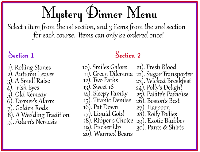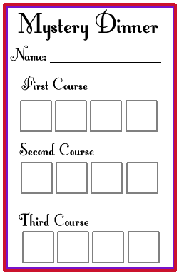 You will be serving a mystery meal dinner where the guests order from a menu, without knowing what those menu items are! There should be much fun when the guests get their courses and find out what they actually ordered!