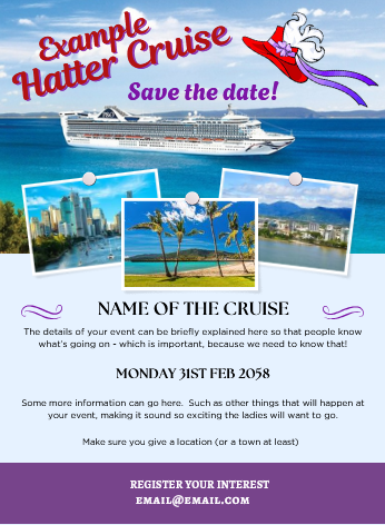 Not all Victorian Hatters check this website, and not all Victorian Hatters are on our facebook group either. Therefore for maximum exposure for your event it is recommended to: